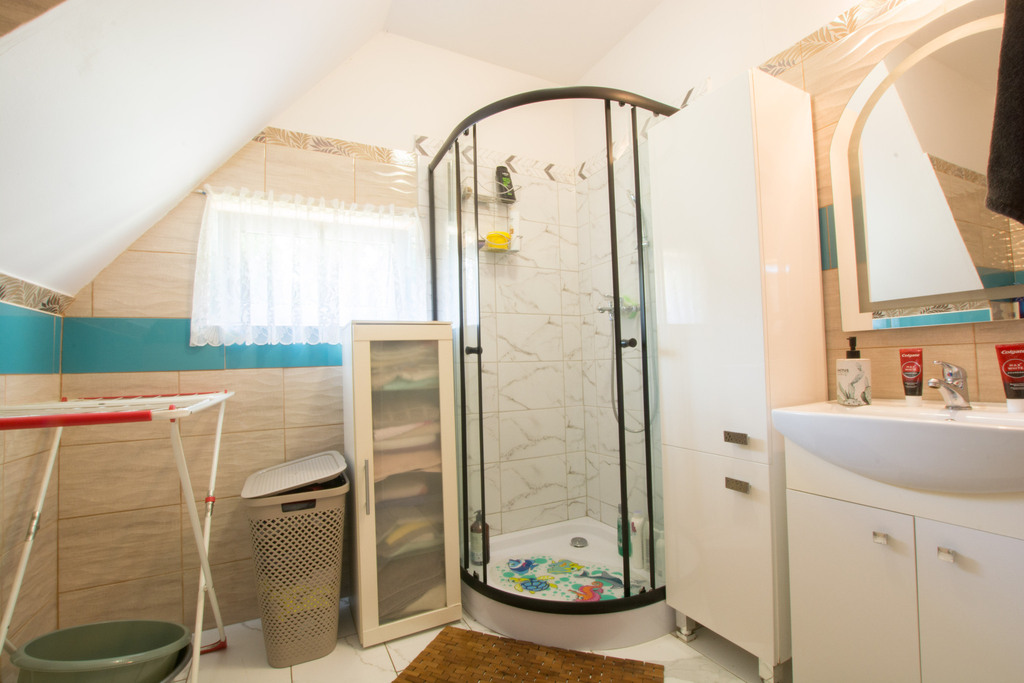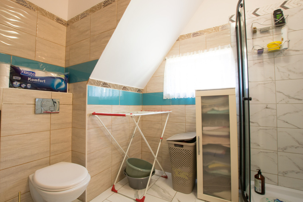 Poddasze: przedpokój, salon, garderoba, kuchnia, sypialnia oraz łazienka z WC. Największy pokój na poddaszu wykończony panelami i gładzią na ścianach. Pozostałe pomieszczenia przygotowane do własnej aranżacji, co daje możliwość dostosowania przestrzeni do indywidualnych potrzeb.