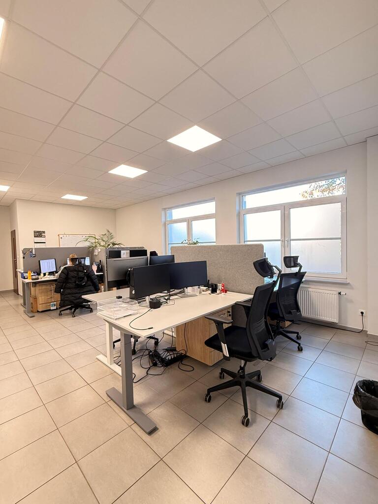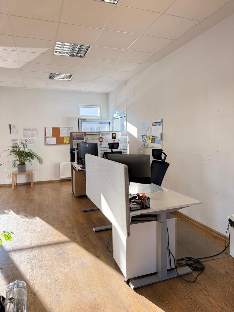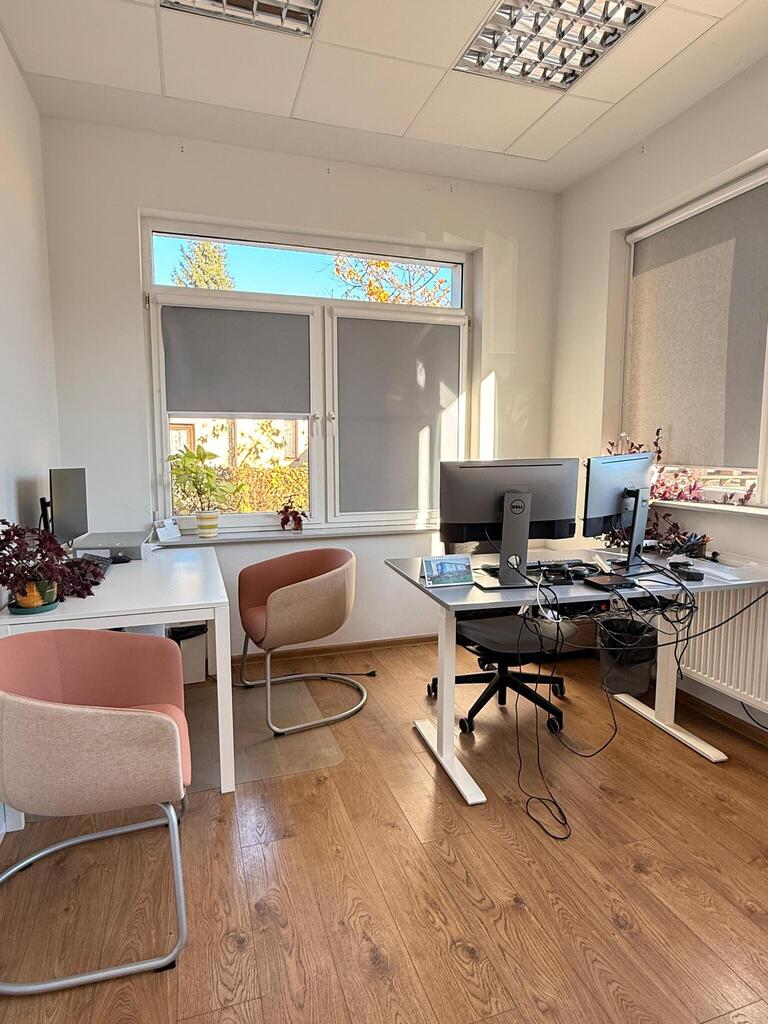Nowoczesna przestrzeń biurowa z dużym, otwartym obszarem wspólnym, dwoma wydzielonymi pomieszczeniami - w tym jednym z pomieszczeniem socjalnym i zapleczem kuchennym.